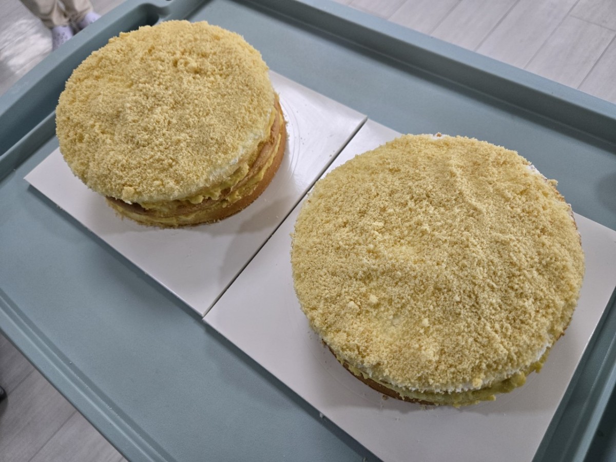 미리 준비된 케이크 시트 위에 고구마 크림을 바르고, 마지막으로 빵가루를 뿌리며 예쁘게 장식하며 즐거운 시간을 보냈습니다.
